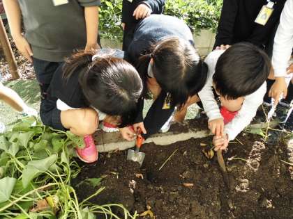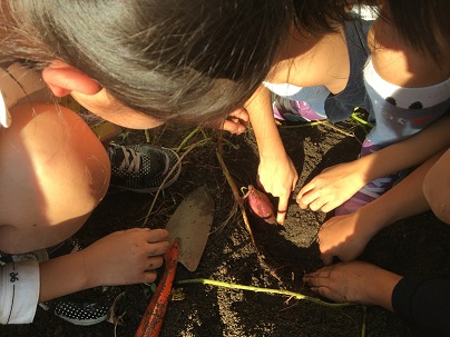 27日(金)に、一学期から育ててきたサツマイモの収穫をしました。手で優しく掘り出すと、サツマイモがたくさんでてきて、子どもたちも大喜びでした。大きいものや、小さなもの、様々な形のサツマイモを手に取り、その後しっかりと見て観察することができました。収穫したサツマイモでおいもパーティーをするのが楽しみです。