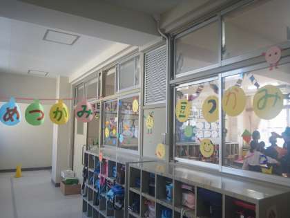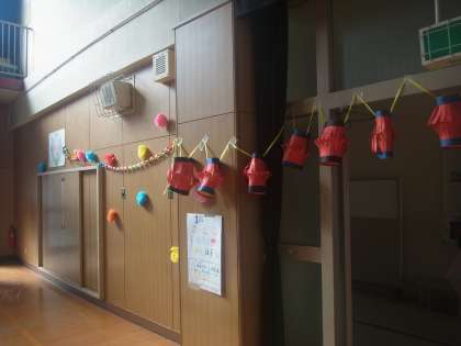 活動の様子と校内の飾りつけです。準備の時間に、遊びコーナーの飾り作りもがんばりました。