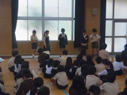 今日(2日)、本年度初めての集会がありました。たてわり班ごとに集合し、全校児童みんなで「じゃんけん列車」をしました。集合時には、班長・副班長さんが、低学年の子を優しく案内していました。長い列をくねくねさせながら、みんなで楽しく活動していました。