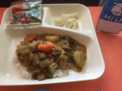 ビーフカレーライス カリフラワーのサラダ 豆こんぶ 牛乳