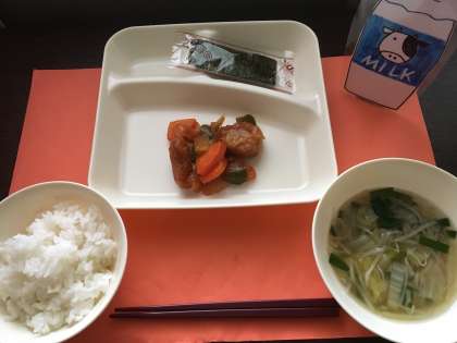 酢豚 中華スープ 焼きのり ごはん 牛乳