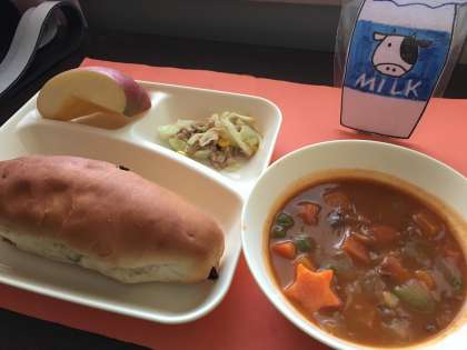 ビーフシチュー ツナとキャベツのソテー りんご レーズンパン 牛乳