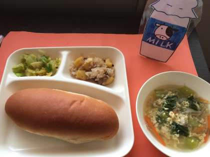 中華おこわ 卵のスープ キャベツのオイスターソース炒め 黒糖パン 牛乳