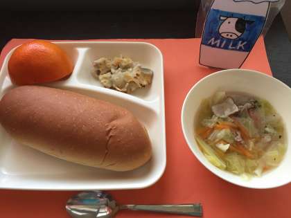 押し麦のグラタン スープ いよかん 黒糖パン 牛乳
