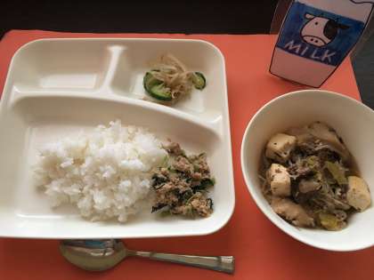 給食の「すき焼き煮」はすき焼きの甘辛い味付けで子どもたちに人気のおかずです。ツナっ葉いためをご飯にのせて。きょうもたくさんいただきました。