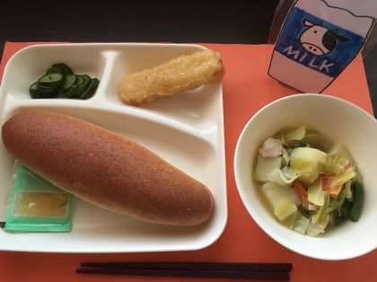いかてんぷら スープ煮 きゅうりのピクルス ライ麦パン りんごジャム