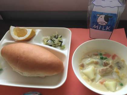コーンクリームシチュー キャベツのひじきドレッシング 河内ばんかん 大型コッペパン マーガリン 牛乳