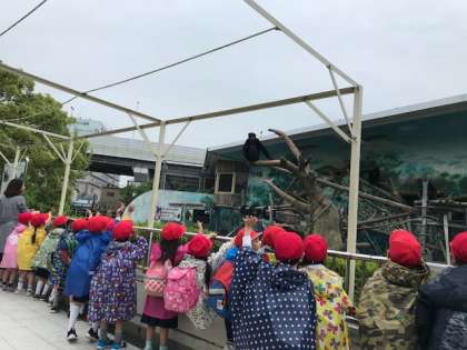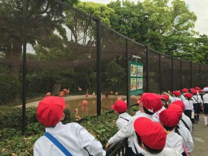 本日1年生は、2年生と同じく天王寺動物園に行きました。お天気が心配でしたが、午前中は何とか大丈夫でしたので、たくさんの動物を見ることができました。ライオンは子ども達のそばまで寄ってきたり、チンパンジーは手を振ってくれたりして、みんな大喜びでした。お弁当も友達と仲良く食べていました。1年生になって初めての遠足、電車の中での態度もすばらしかったです。よくがんばりました!!