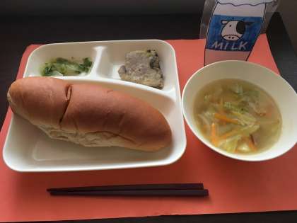 焼くと身が固くなるカツオですがマヨネーズで柔らかくなり、子ども達もおいしくいただいてます。「スープ」と「サラダ」で野菜もしっかり採ることができました。
