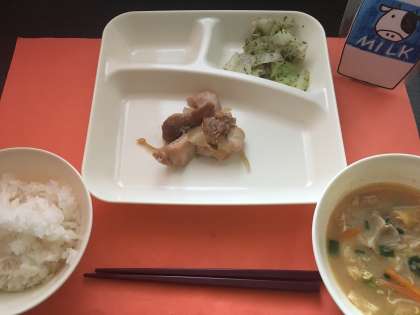 鶏肉の甘辛焼き みそ汁 キャベツの赤じそあえ ごはん 牛乳