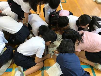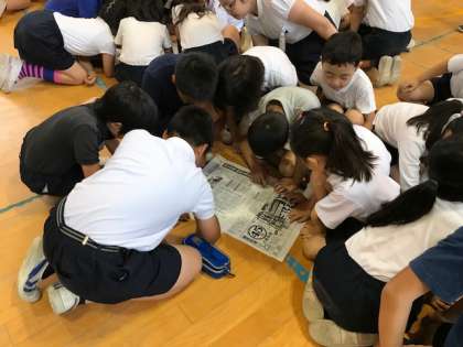 今朝の児童集会は、講堂で「文字さがしゲーム」が行われました。集会委員会の児童が出したお題の字を、たてわり班のチームで、新聞の中からできるだけ多く探し出すゲームです。班ごとに頭を突き合わせて、必死で文字を探していました。さあどの班が一番多く探せたか、結果は給食時間中に発表です!!