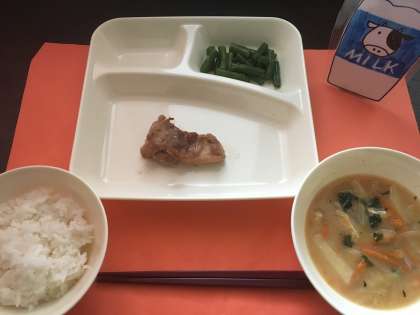 鶏肉のバターしょうゆ焼き みそ汁 三度豆のからしじょうゆ和え ごはん 牛乳