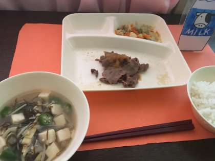 牛肉のおろしじょうゆかけ もずくとオクラのとろり汁 野菜のそぼろいため ごはん 牛乳