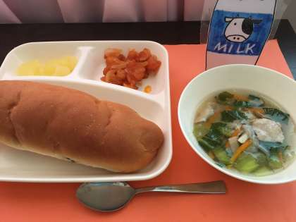 「エビのチリソース」は、下味をつけたえびにでんぷんをまぶし揚げ、別でつくったチリソースに絡ませて作ります。低学年には辛いと感じる子どももいたようですが、「レーズンパン」や「りんご缶」や牛乳と共においしくいただいてました。
