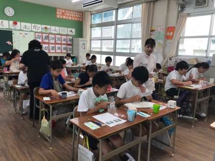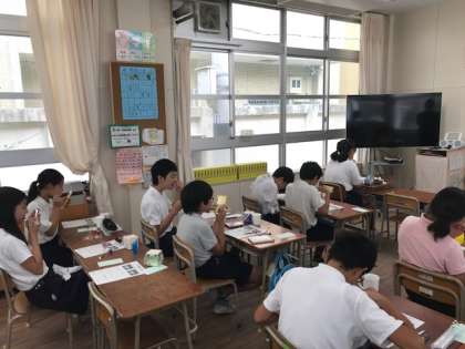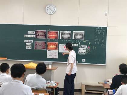 本日2,3時間目に「歯と口の健康教室」がありました。歯周病について、詳しく歯科衛生士の方から説明していただきました。そのあと歯を赤く染めて、自分の歯の汚れているところを確認し、実際に正しい歯磨きの仕方も学習しました。