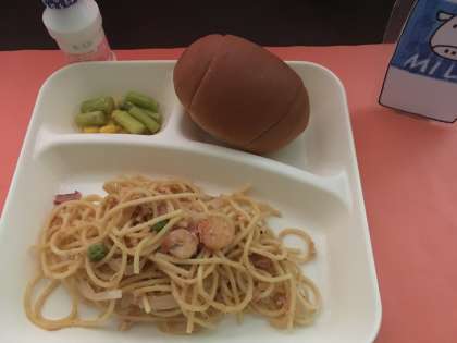 オリーブ油でにんにくをいためてベーコンの旨味も加え、生のトマトの酸味もきかせた本格派「シーフードトマトスパゲッティ」でした。アスパラガスのグリーンとコーンの黄色で彩も良く見た目もおいしく、今日もしっかりといただきました。