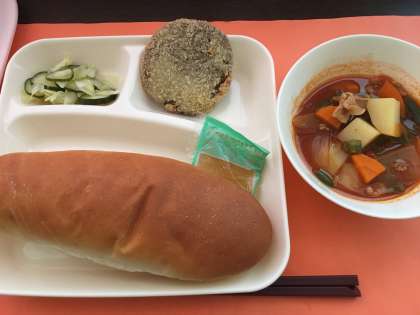チキンレバーカツ ケチャップ煮 キャベツときゅうりのサラダ コッペパン りんごジャム 牛乳