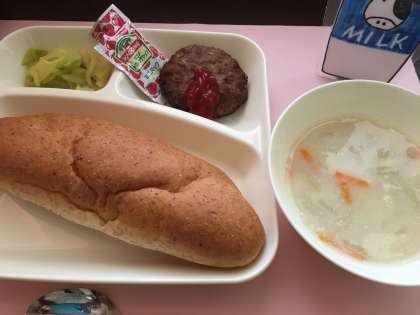 焼きハンバーグ 豆乳コーンスープ キャベツのカレーソテー ライ麦パン 牛乳