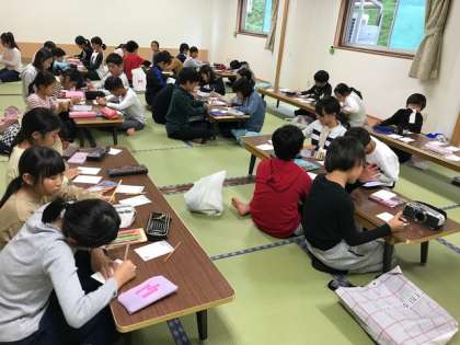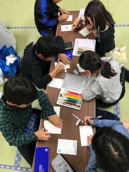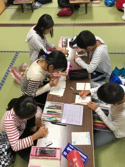 入浴の待ち時間を使って、今日の楽しかった出来事をはがきに書いています。色鉛筆できれいに絵も描いています。どんなはがきが届くのか楽しみにしていてください。