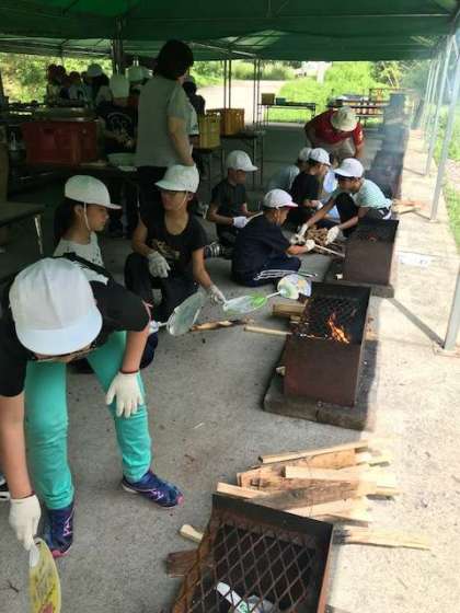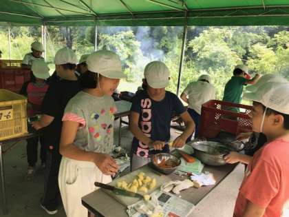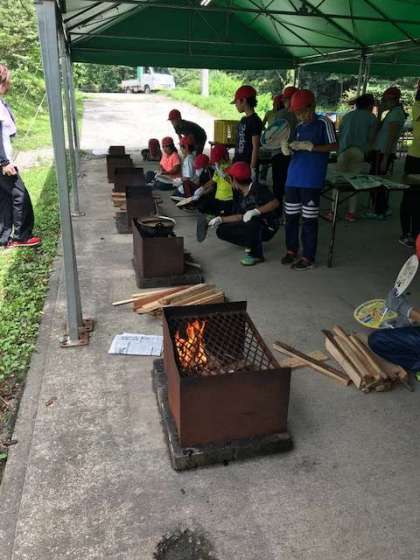 みんなで協力してカレーを作っています。火おこしがなかなか難しいです。