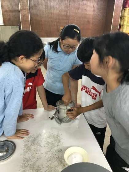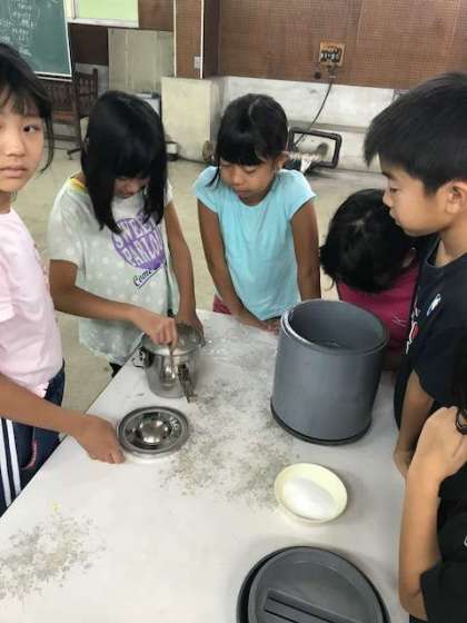 班ごとにバニラかココア味を選んで、容器に材料を入れ、転がします。20分間転がすのは、かなりハードですが、美味しいアイスクリームをめざしてがんばってます。