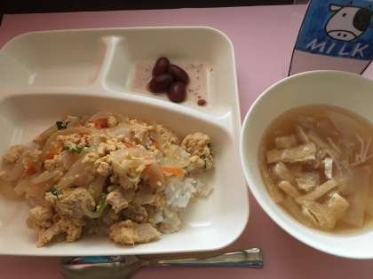 親子丼 とうがんのすまし汁 金時豆の煮もの ごはん 牛乳