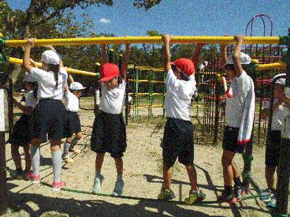 わんぱく公園での大きな遊具でも、大はしゃぎです。エネルギーあふれるほど、うんていや滑り台でいっぱい遊んで帰りました。ちょっぴり長い距離でしたが、最後まで頑張って歩いた1・2年生でした。