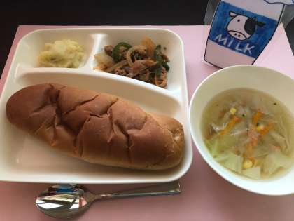 豚肉と野菜のケチャップソテー スープ スイートポテト 黒糖パン 牛乳