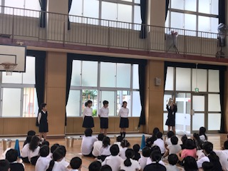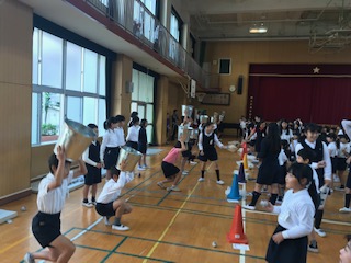 今日の児童集会は「ボール投げゲーム」でした。頭に置いたバケツにボールを投げ入れるゲームです。少しでも多くボールが入るように、みんな慎重に投げていました。結果は給食時間に発表します。楽しみですね。