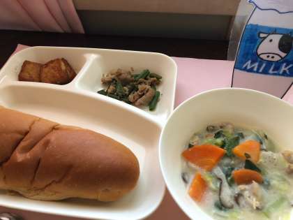 はくさいのクリーム煮 あつあげのごまじょうゆかけ 豚肉と三度豆のオイスターソース炒め 黒糖パン 牛乳