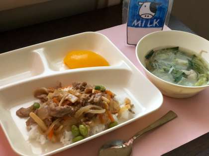 ピリ辛丼 中華スープ 黄桃缶 ごはん 牛乳