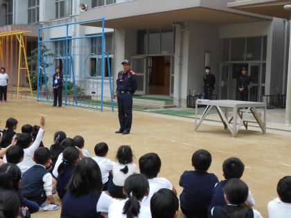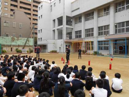 本日5時間目に、火災を想定した避難訓練が行われました。緊急ベルの合図で運動場に避難した後、福島消防署の方から、速やかに行動することの大切さについて聞きました。その後3年生から6年生は運動場で、実際に消火器を使って消火体験をしました。1,2年生は講堂で、火事にまつわるDVDを見ました。福島消防署の皆様、大切なお話をたくさんしていただきありがとうございました。