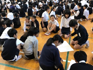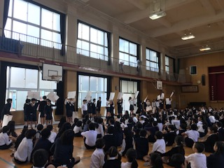今週の児童集会は「伝言ゲーム」でした。たてわり班ごとに1文字ずつ伝えていき、出来上がった言葉を並べて文章を作りました。ちょっと間違った字もありましたが、みんなで協力して、長い文章が完成しました。