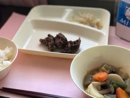 今日は年に一度、くじらが登場する日です。今年は「たつたあげ」です。多めのしょうが汁と、酒 しょうゆで下味をつけ、片栗粉をまぶして揚げています。どのクラスでも大人気のおかずとなりました。