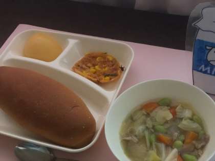 豚肉と野菜のスープ煮 変わりピザ 白桃缶 黒糖パン 牛乳