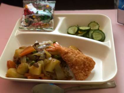 今日はいつものカレーの上に、えびフライを一尾のせた「えびフライカレーライス」が登場しました。サクッした歯ごたえにおいしく揚げられたえびフライは、しっぽまで食べられた子どもがたくさんいたようです。今日も楽しくおいしく給食をいただくことができました。