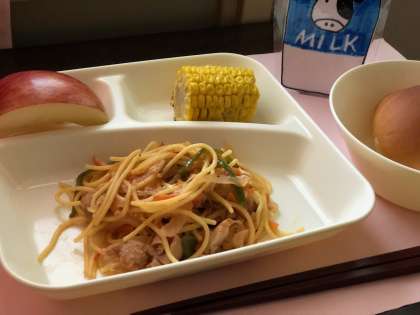「チキントマトスパゲッティ」はウインナーも入って、子どもたちには大人気の献立です。「焼きとうもろこし」や「りんご」は、かじりついて食べるために少し苦労もしましたが、がんばって今日もおいしく給食をいただくことができました。