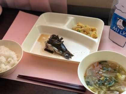 今日は「いわしのしょうが煮」を骨ごと、または上手に骨を取りながらよくかんでいただきました。だしで炊いた高野豆腐と一緒に、今日もしっかりとおいしい給食をいただくことができました。