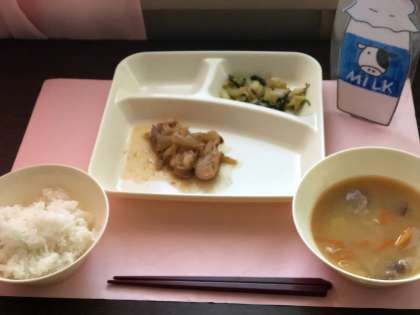 ごまあえのきくなは香りの強い野菜なので苦手な子どもが多いかなと思いましたが、はくさいと一緒に調理されていて食べやすかったようです。いつものおいしいみそ汁と、焼鳥のような甘辛焼きと今日もおいしい給食をしっかりといただくことができました。