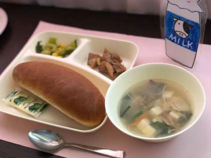 鶏肉のオイスターソース焼き 糸寒天のスープ チンゲンサイとコーンの中華あえ コッペパン マーガリン