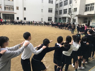 今日の児童集会は「ジェンカ」を児童全員で踊りました。たてわり班の班長を中心に「右右・左左・前・後ろ・・・」と声を掛け合いながら、リズムにのって楽しく踊ることができました。