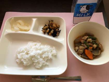 筑前煮は人参、蓮根、ゴボウなどの野菜を油でいため、甘辛く味付けした煮ものです。乾燥大豆から作ったひじき豆とともに大人気で、よく噛んで食べることができたと思います。今日も無事おいしい給食をいただくことができました。