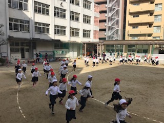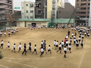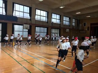 先週から、かけあし週間が始まりました。運動場が狭くなっているので、講堂と運動場に分かれ、学年ごとに20分休みに走っています。