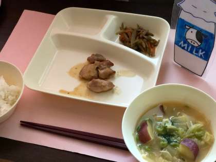 「鶏肉のてり焼き」は、砂糖、みりん、こいくちしょうゆで下味をつけ、焼き物機で焼いています。さつまいもの入った優しい味のみそ汁に、きんぴらごぼう。大好きな和食献立を今日もおいしくいただきました。