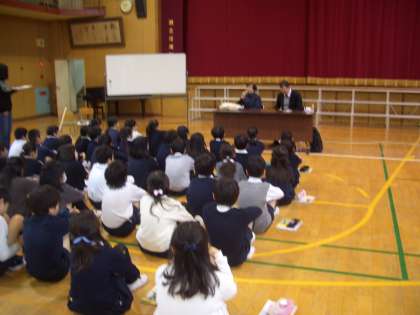 出前授業で、アイマスク体験を行いました。エレベーターのボタンを押したり、手すりの場所を伝えたりすることがとても助けになるという内容のお話でした。少しのやさしさと思いやりで、みんなが過ごしやすい社会を作り上げることができるということを学ぶことができました。