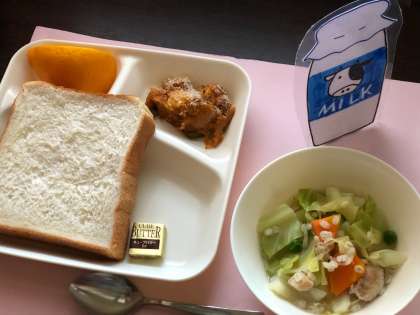 とうふのミートグラタン 押し麦と野菜のスープ煮 デコポン 食パン バター 牛乳