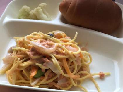 サケフレークを使って牛乳や生クリームを入れたクリームスパゲッティはこれもまた子どもたちに大人気で、どのクラスもペロッとたいらげてしまいました。