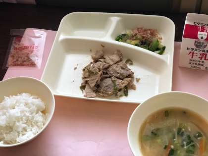 豚肉のごまだれ焼き みそ汁 こまつなのおひたし ごはん 牛乳