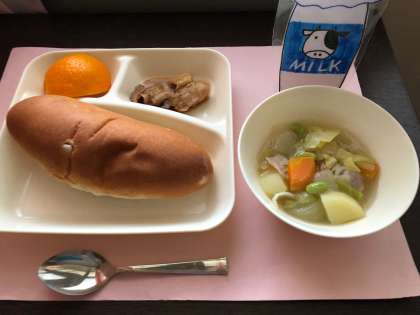 鶏肉のみそバターソース スープ煮 デコポン おさつパン 牛乳