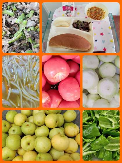 『牛肉の香味焼き』は、牛肉にワイン、こしょう(粗挽)、オールスパイスなどで下味をつけピーマンと混ぜ合わせ、風味豊かにこんがりと焼いています。『トマトのスープスパゲッティ』は、新鮮な生のトマトをふんだんに使用し、にんにくとベーコンで旨味を引き出したスープ仕立てのスパゲッティです。『なし(二十世紀)』は、甘味と酸味のバランスが良く美味しかったです。